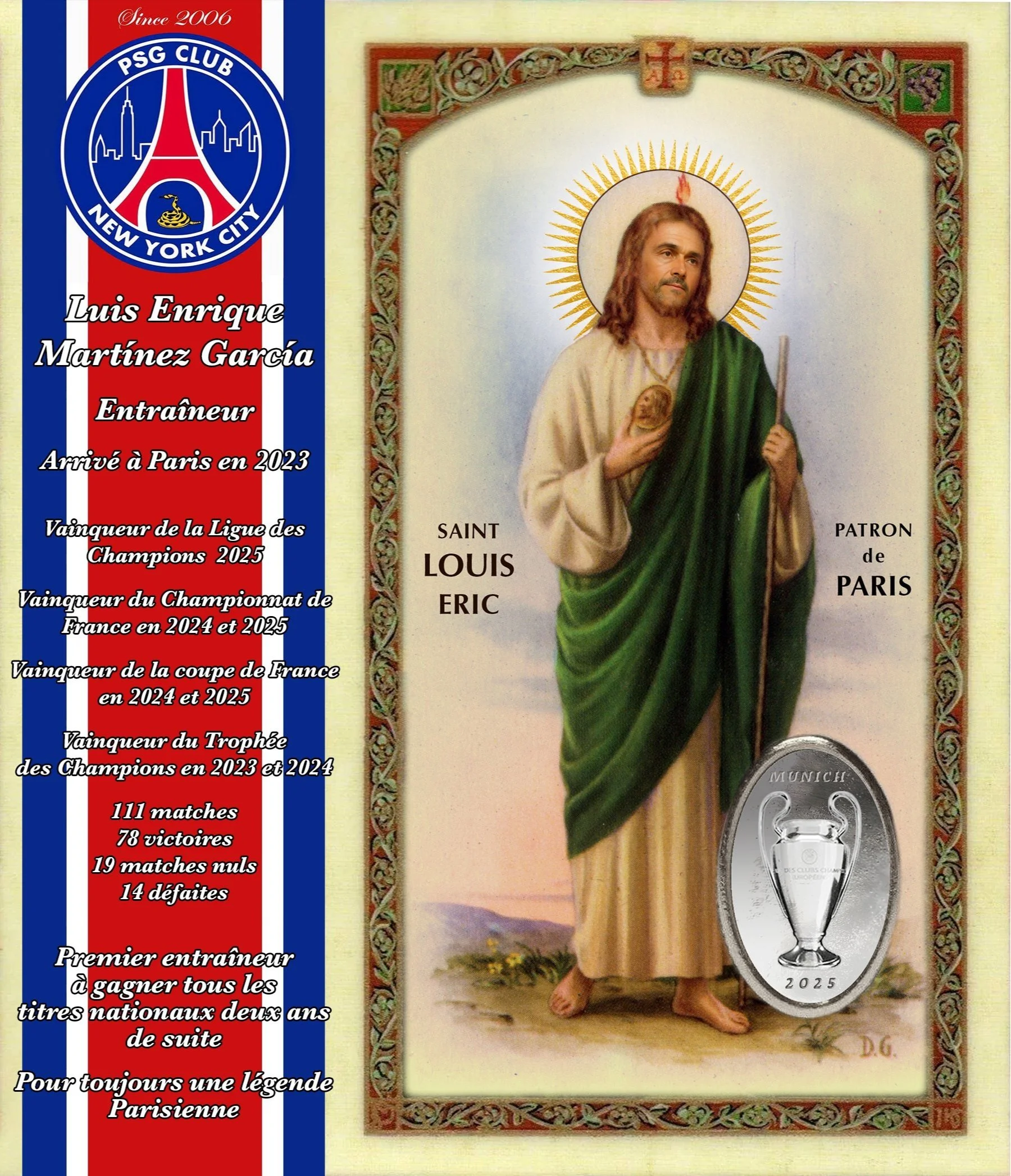 PSG Club NYC wished to canonize Coach Luis Enrique in light of his recent success. Stadium rendered Enrique as Saint Jude who is The Patron Saint of Impossible Causes.